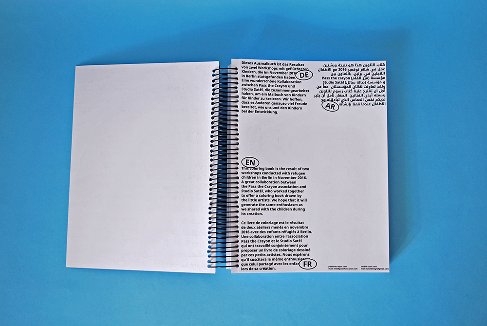 Après avoir mené des ateliers d’art auprès d’enfants réfugiés à Berlin, le Studio Satël recueilli l’ensemble des dessins produits pour les transformer en livre de coloriage. Ils souhaitaient offrir aux enfants la possibilité de voir leur créativité valorisée en composant leurs dessins en livre. Chacun d’eux a pu participer à la conception de cet objet imprimé. Des coloriages pour et faits par les enfants.